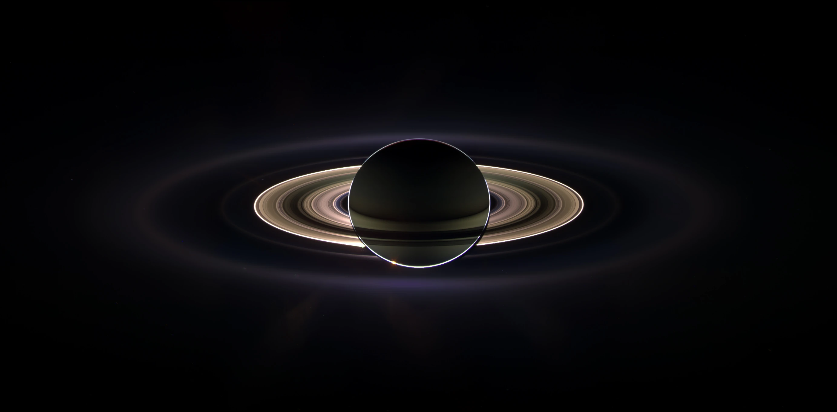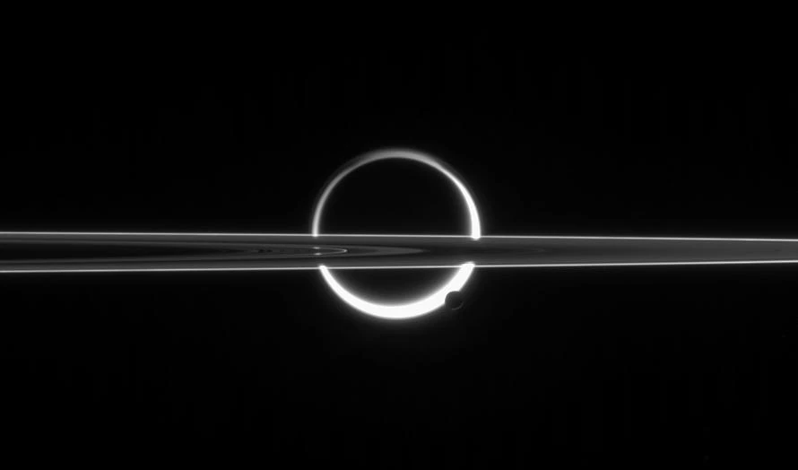 Saturn's rings cut across an eerie scene that is ruled by Titan's luminous crescent and globe-encircling haze, broken by the small moon Enceladus, whose cryovolcanos are dimly visible at its south pole. North is up.